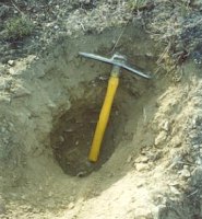 Naw, I’ve spent 20 minutes on this stupid thing. Might as well finish. After all, it’s only about an inch deeper. So I stuck the handle of my pick down in the hole and scrubbed it around trying to loosen things up a bit. Reaching down up to my elbow, I claw and scoop up the dirt and rocks with my fingertips.